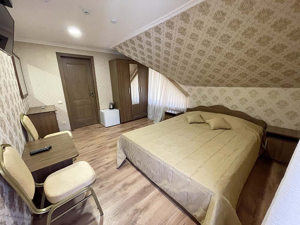 Просторный однокомнатный номер площадью 20-25 м², предлагает хорошие условия для отдыха. Номер оформлен с элегантным дизайном и имеет вид на горы, лес и уютный внутренний двор. В номере гармонично сочетаются зона отдыха и спальная зона, что делает его функциональным и уютным.