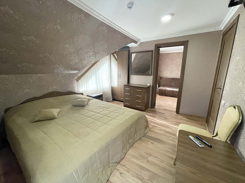 В спальных комнатах установлены комфортабельные двуспальные кровати и кресло-кровать, а в гостиной — раскладной диван-кровать, который может служить дополнительным местом для отдыха или сна, кухонная зона и столовая зона, включающая в себя: холодильник, чайник, микроволновую печь и определенный набор посуды. Ванные комнаты оснащены всем необходимым для комфорта: душевыми зонами и всем необходимыми косметическими наборами. Этот номер идеально подходит для четверых гостей или на две семьи, с возможностью размещения детей в гостиной, предлагая все условия для незабываемого пребывания в отеле.