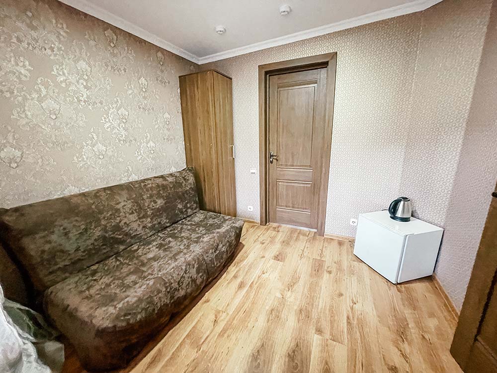 В спальной зоне установлена комфортабельная двуспальная кровать, а в зоне отдыха — раскладной диван-кровать, который может служить дополнительным местом для отдыха или сна. Ванная комната оснащена всем необходимым для комфорта: душевой зоной и всем необходимым косметическим набором. Этот номер идеально подходит для двоих гостей или гостей с детьми, предлагая все условия для незабываемого пребывания в отеле.
